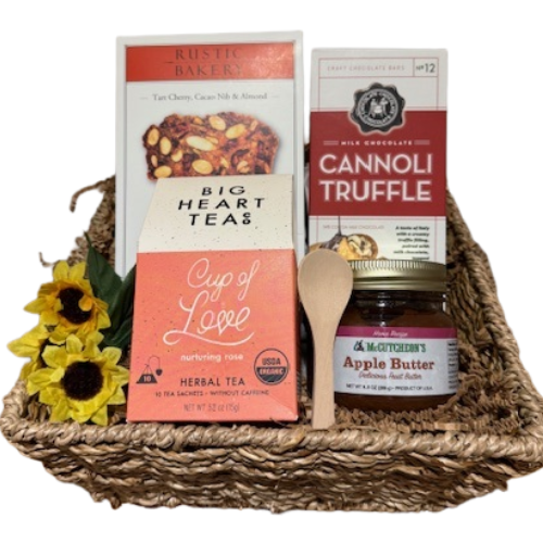 The Cup Of Love Tea Basket offers a thoughtful selection designed to delight tea lovers. Featuring a box of 10 herbal tea sachets paired with Tart Cherry Crisps and rich cannoli chocolates, this basket balances sweet and savory flavors. Apple butter with a serving spoon adds a gourmet touch, perfect for enhancing your tea experience. Ideal for gifting, it combines quality treats and comforting tea in one elegant package.